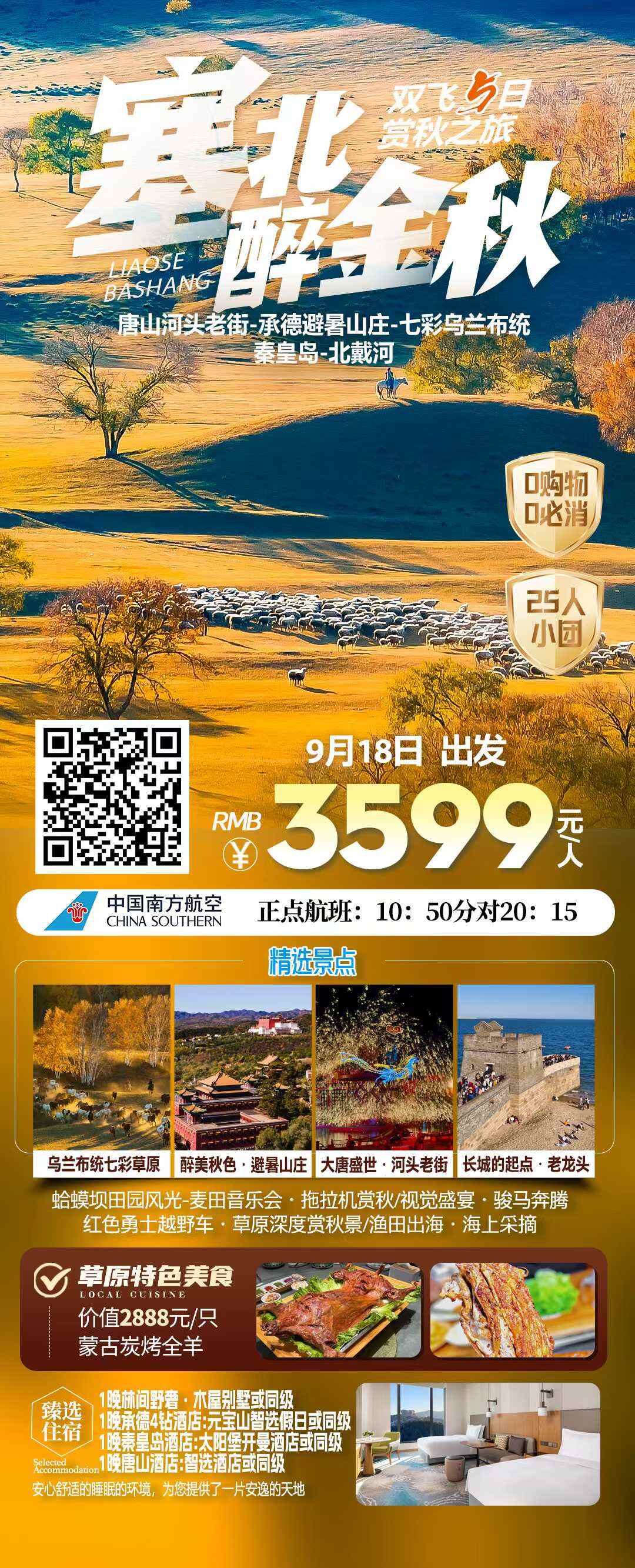 [太陽]避暑+烏蘭布統(tǒng)+秦皇島+唐山雙飛5天 [啤酒]【舌尖邀約】體驗蒙古待客最高禮儀烤全羊,含4早7正餐,高餐標40元--50元/人/正 【正點航班】10:50對20:15分